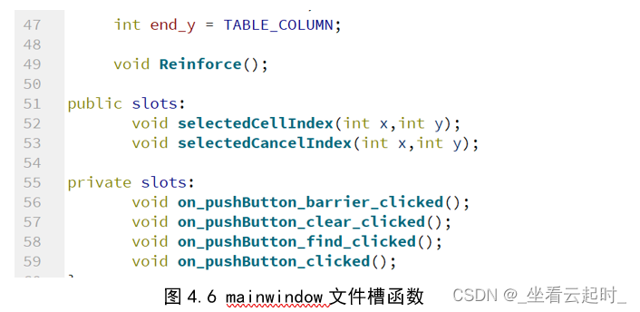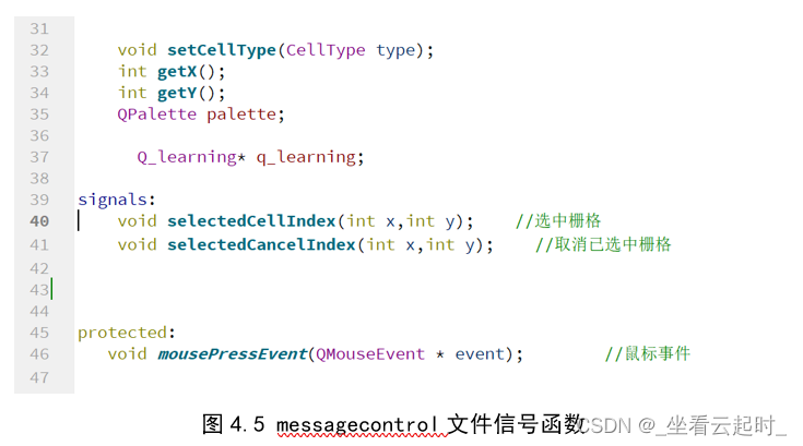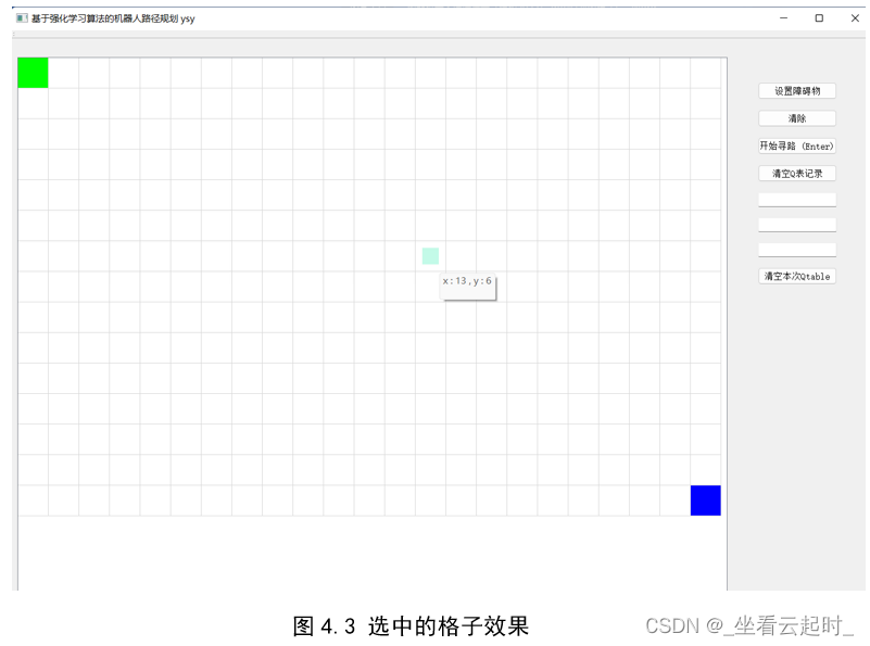 Mainwindow中放置了按钮的槽函数,以及强化学习的训练流程,控制的是主页面,Mainwindow.ui也是绘制的主页面,messagecontrol控制的是单元格,它的ui是绘制单元格的效果,messagecontrol.cpp中定义了鼠标事件函数和单元格颜色更改函数,q_learning不需要ui,里面定义了强化学习的action函数,用来控制机器人行动,定义了函数actpunish(),用来初始化一些特殊位置的Q值,定义了get_expected_max_reward(),用来返回下一步选择的最大Q值,也就是对应公式中的