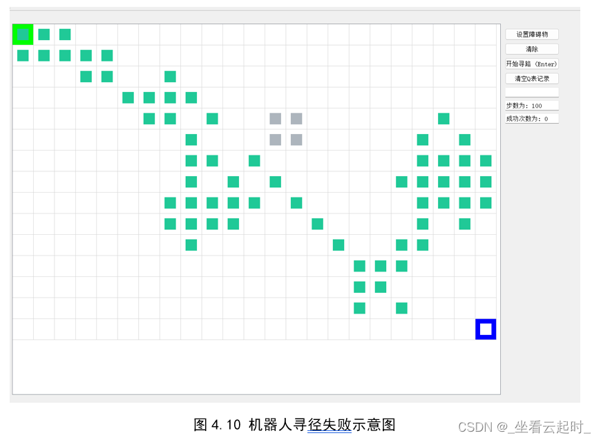 该按钮点击后,机器人从起始点出发开始寻径,按钮文字会从“开始寻路(Enter)”变为“停止寻路 (Enter)”,再次点击按钮,寻径就会暂停,可以随时切换状态。