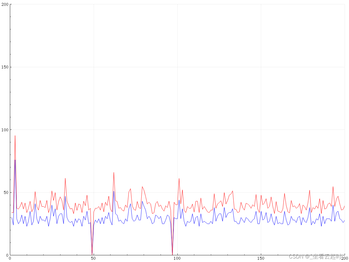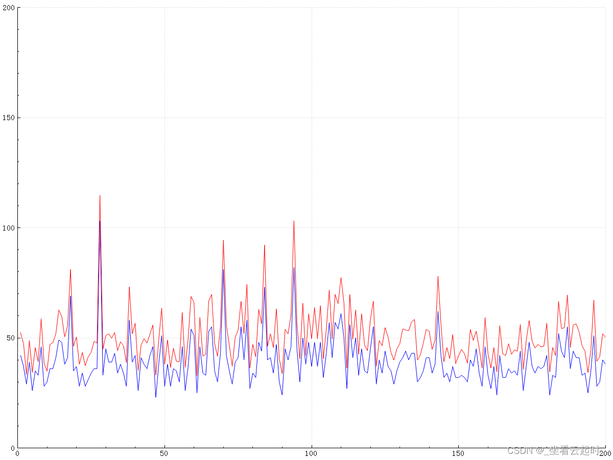 使用第三方库QCustomPlot,绘制折线图保存图片到本地,x轴为训练次数,折线为步数(蓝色)和行走路径长度(红色),寻径失败时步数和路径长度都设置为0。