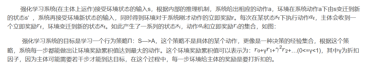 主体(Agent)通过与环境(environment)交互进行学习,交互包括行动(action),奖励(reward),状态(state)。交互过程表述如下:每一步主体都根据策略选择一个行动方式执行,比如说向前走、向后走,然后感知做出该行动后的立即奖励,还有下一步的状态,该状态也就是环境的状态,通过已有的经验再修改自己的策略做出下一个动作,经验就是根据这一步一步的动作学习来的,每一步都积累一些奖励值(立即奖励),目标就是让累积的奖励值最大。