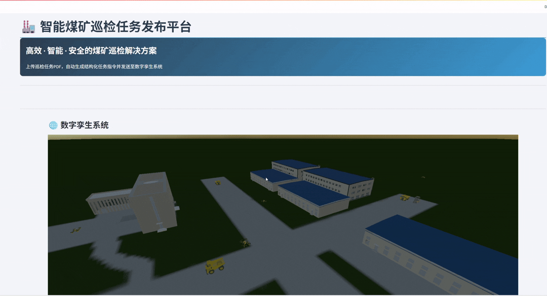 本项目创新地构建了高保真煤矿数字孪生场景,将物理世界的巡检设备(无人机、巡检车)及其运行状态实时映射至虚拟空间。管理人员可通过AI PC上的三维可视化界面,直观地实时监控巡检轨迹、设备状态,并能直接接收诊断结果与故障告警,打破了管理端与执行端的信息壁垒。
