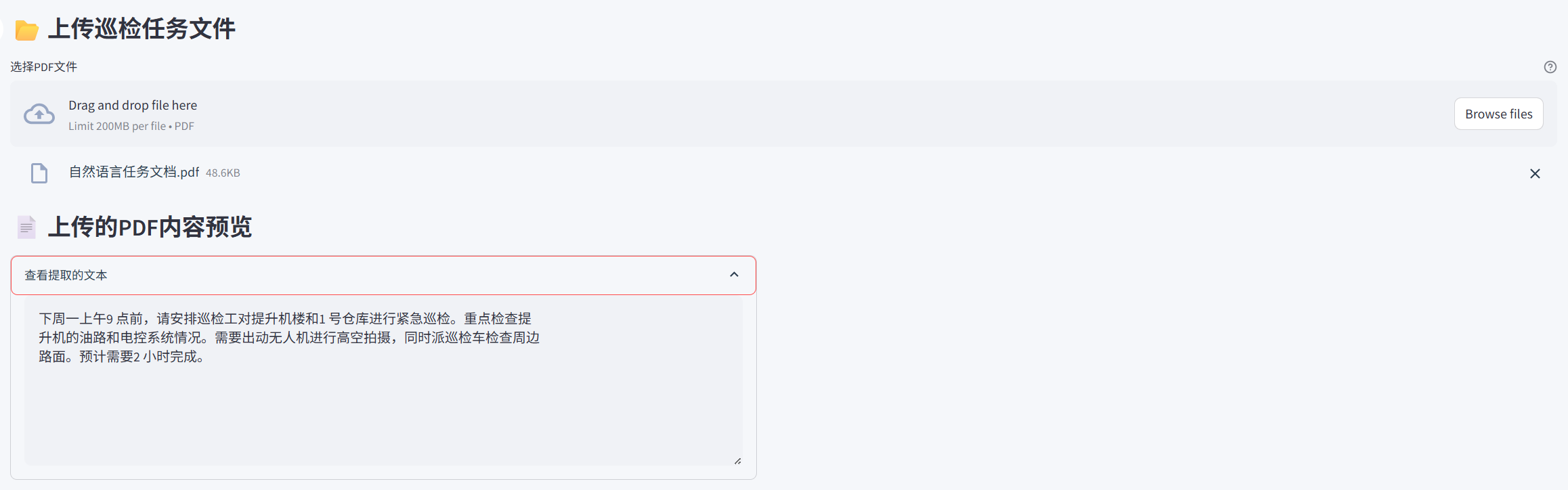 点击按钮上传巡检任务文件,Qwen解析文档提取文本,提供预览: