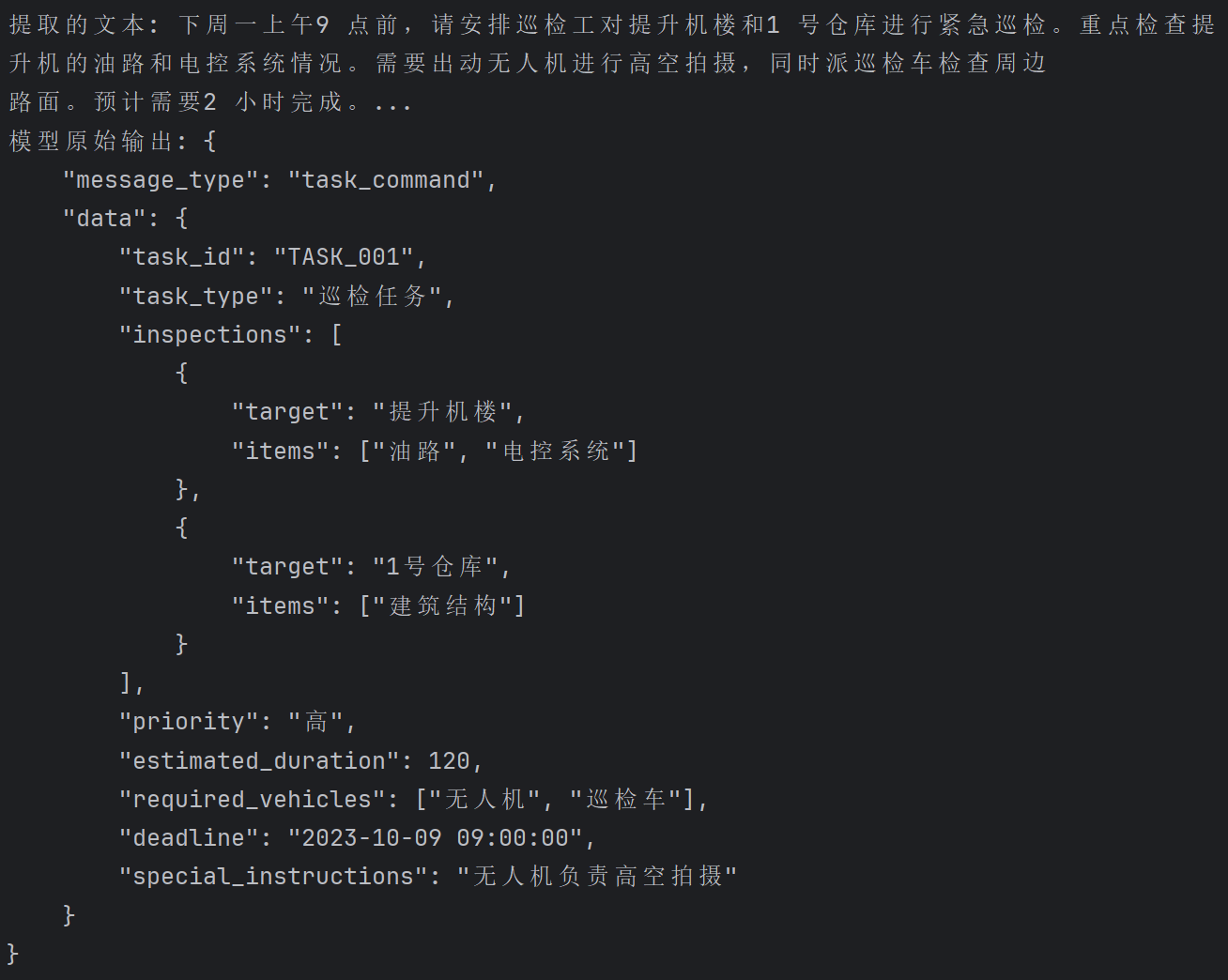 点击解析任务按钮,Qwen将自然语言描述的巡检任务解析为json格式的结构化任务: